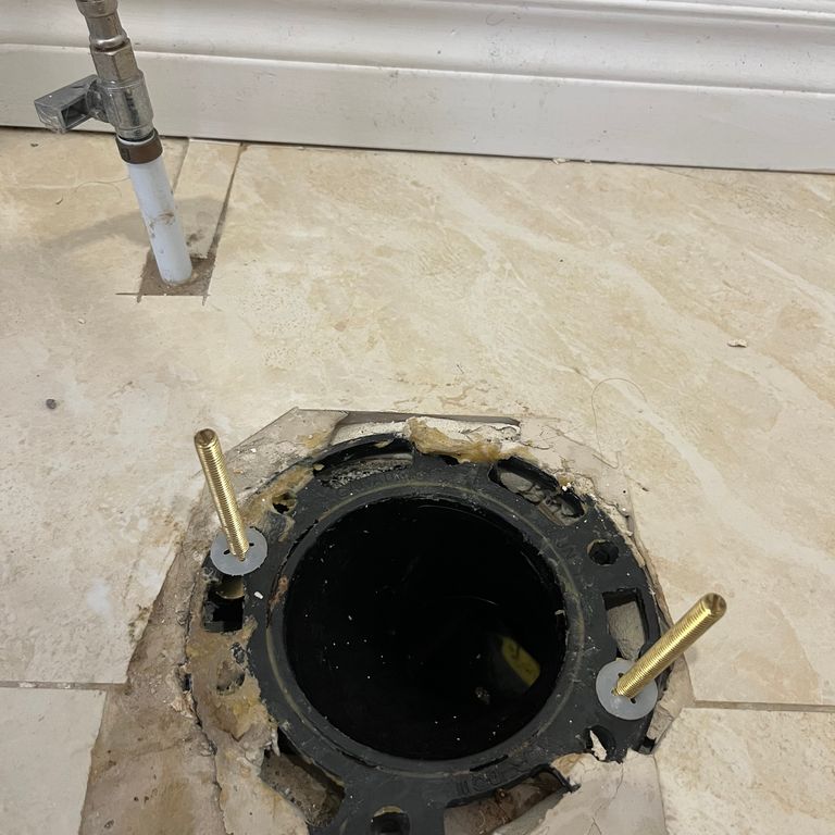 The existing toilet flange was installed in the incorrect orientation so that the bolts do not properly attach to it and do not secure the toilet to the floor. So we bought a fixit repair ring that needs to be drilled into the floor on top of the existing flange.